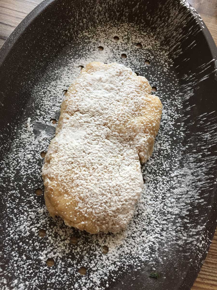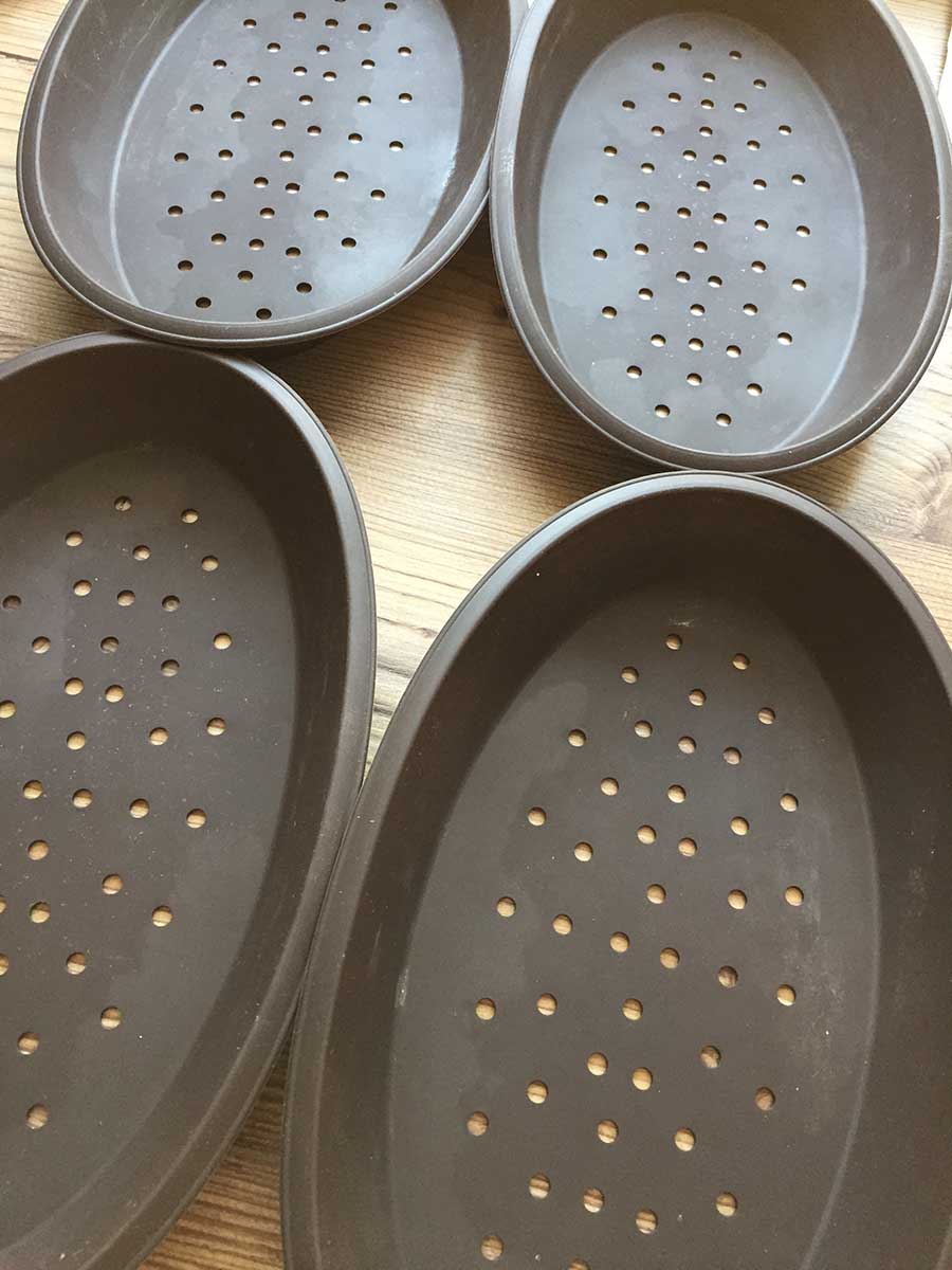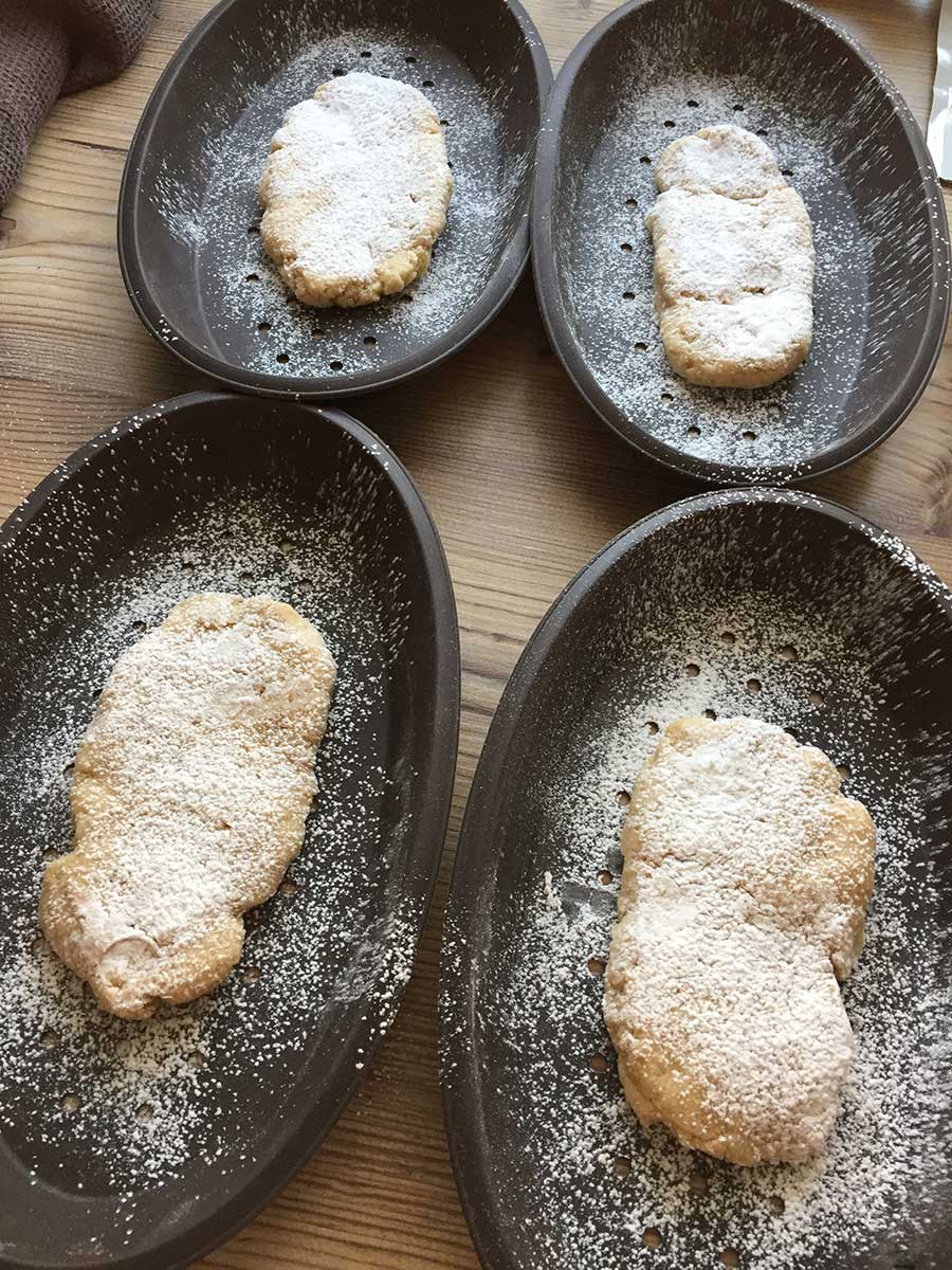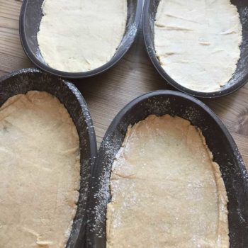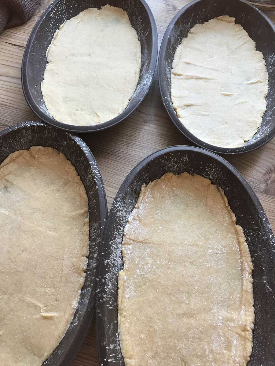 Mit feuchten Händen in vier Portionen teilen und zu ovalen Fladen formen - siehe Bild unten!