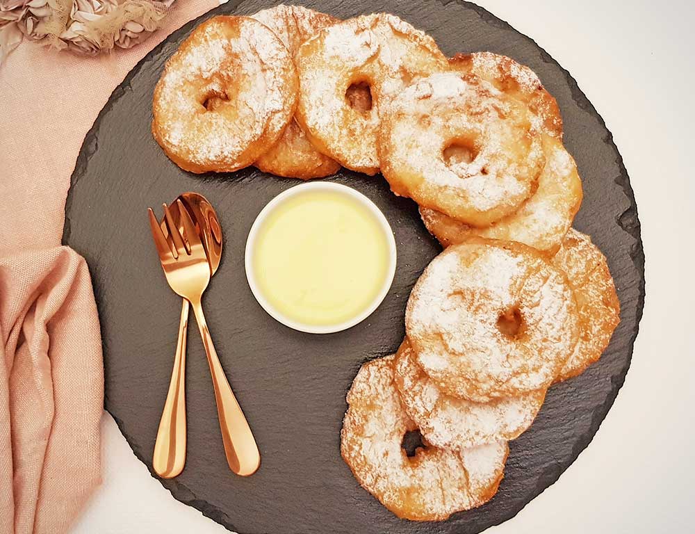 Danach im Teig baden und ausbacken. Mit Vanilletraum bestreuen.