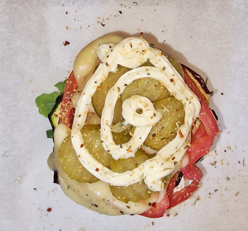 In der Zwischenzeit den Boden der Buns mit Frischkäse bestreichen, etwas Mayo drauf und mit Rucola belegen. Das Türmchen drauf setzen, Mayo drauf, Essiggurken und Rucola, Bundeckel drauf und genießen.