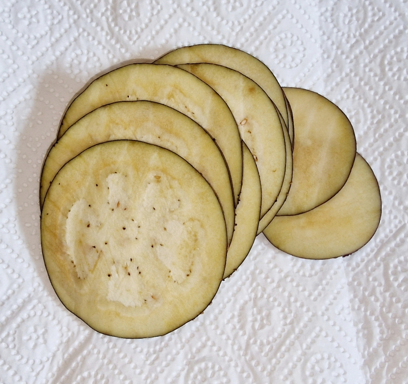 Scheiben einsalzen und in einem Sieb für 15 - 20 Minuten Wasser ziehen lassen. Danach auf Küchenkrepp auflegen und etwas abtrocknen.
