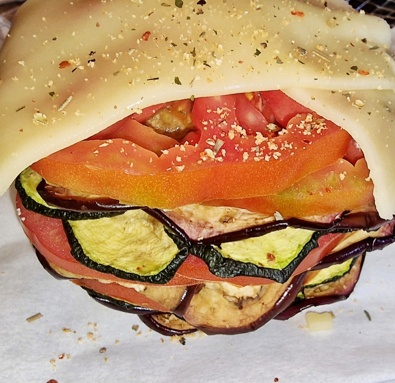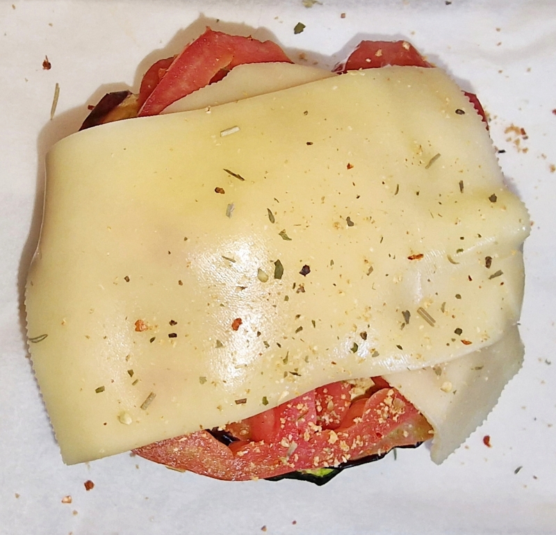 Frischkäse, ein paar Käsescheiben kleiner schneiden und dann mit dem Schichten beginnen. Dafür einen Kreis aus Auberginen in Größe der Buns auflegen, dazwischen kleingeschnittenen Käse, etwas Frischkäse draufschmieren, und weiter mit den Zucchinis, dann Tomate ...das wiederholen. Am Ende Käse drauf.