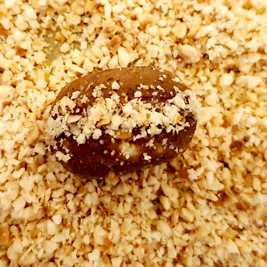 Den Rand in den gerösteten & gehackten Haselnüssen drehen und den Rand leicht andrücken.
