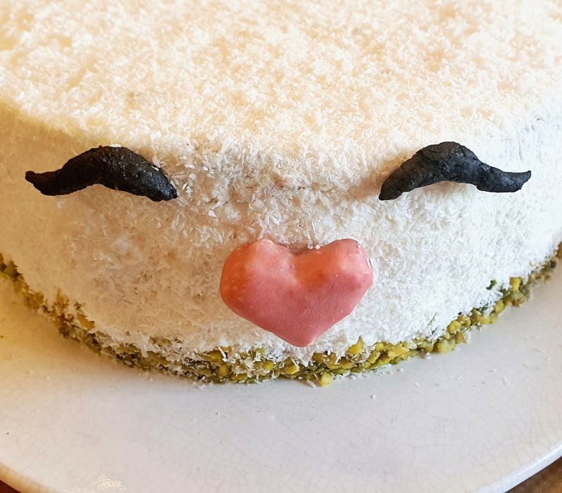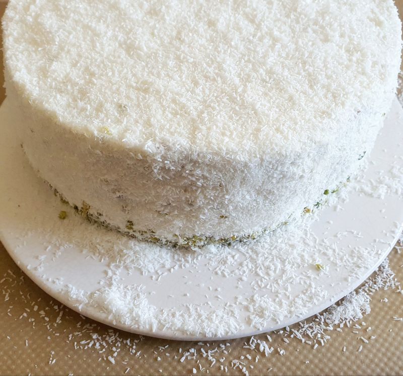 Die Torte aus dem Tortenring nehmen und mit der Frischkäsecreme einstreichen. Mit Kokosflocken einstreuen.