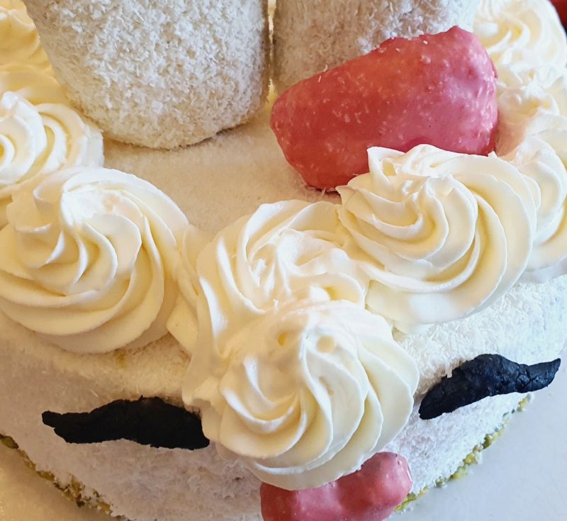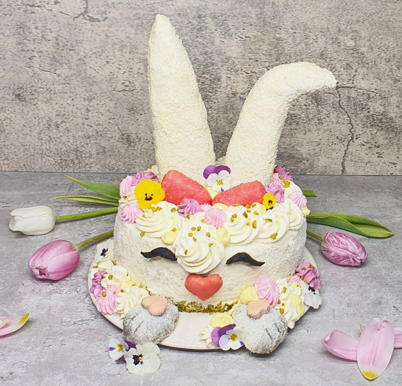 Mit der weißen Creme oben auf der Torte mittelgroße Kreise aufspritzen. Dann die Ohren mittig aufsetzen. Damit die Ohren nicht nach hinten kippen, hab ich hinter den Ohren je 1 größere Erdbeere versteckt, die etwas dagegen hält, sollten die Ohren kippen. Die Schleife vor die Ohren setzen und zuletzt die Pfoten (meine sind a bissl zu groß geraten).