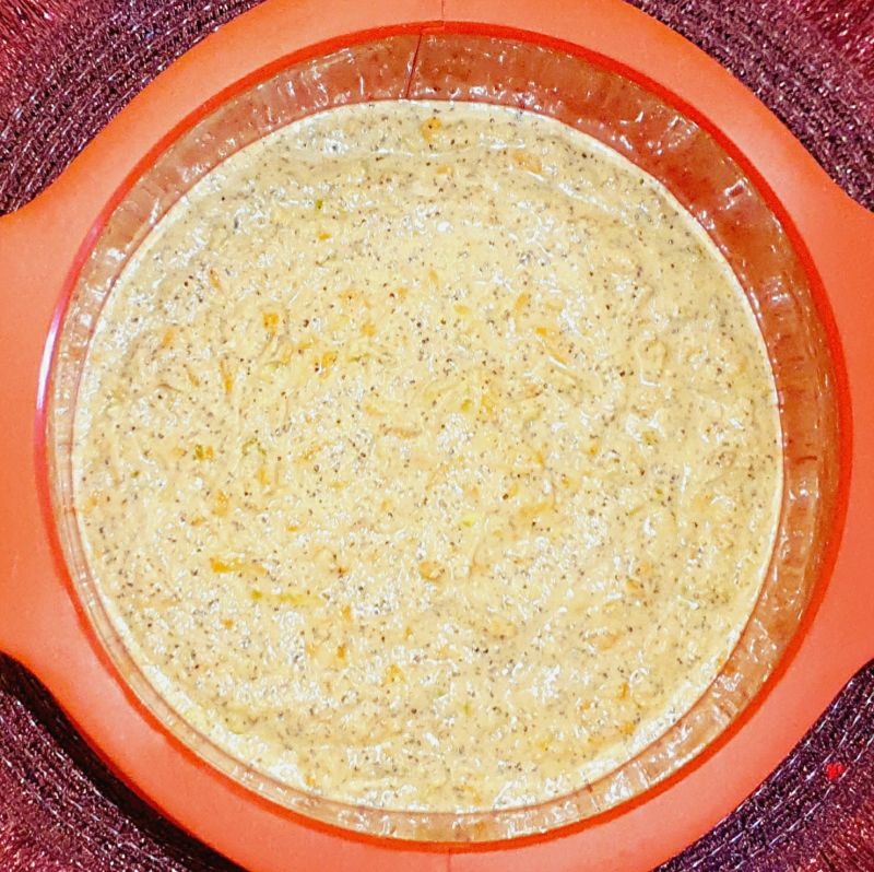 Nach dem Rasten des Teiges, die Karottenmischung mit einem Löffel unter den Teig rühren. Zuletzt die geschmolzene Butter zum Teig geben und verrühren.
