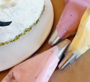 Dann mit der eingefärbten Creme verschieden große Tupfen aufspritzen. Mit gehackten Pistazien bestreuen und mit Blüten verzieren.