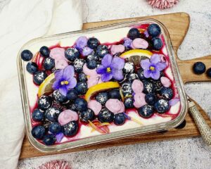 Die restliche Heidelbeerecreme für die Deko auf die Puddingschicht gießen, diese vorher nochmal kurz in der Mikro erwärmen. Dann mit Zitronenscheiben und den restlichen Blaubeeren dekorieren. Mit Vanilletraum bestreuen.
