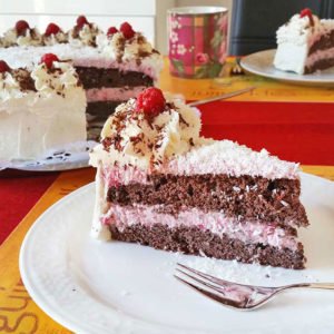 Die übrige Sahne steif schlagen und die Schokolade mit einem scharfen Messer fein hobeln. Den Tortenring entfernen und die Torte vollständig mit 2/3 der Schlagsahne überziehen. Mit der restlichen Schlagsahne, den Himbeeren, der gehobelten