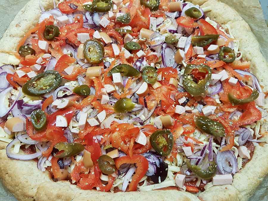 Zwiebeln und Paprika in feine Streifen schneiden und auf der Pizza verteilen. Wir hatten ein bisschen was von den Würstchen übrig und haben diese in Würfeln ebenfalls noch auf die Pizza geworfen – zusammen mit einer Handvoll Jalapenos, für alle die es gerne extra scharf mögen.