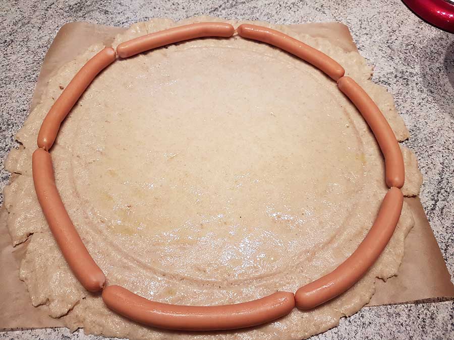 Den Pizzateig ca. auf Backpapier-Größe ausrollen (Backpapier vorher gut mit Olivenöl einfetten!). Die Würstchen ca. 3 cm vom Rand entfernt platzieren und von außen mit überstehendem Teig umwickeln. Den Teig auf der Innenseite gut festdrücken und zum Schluss mit dem restlichen Olivenöl bestreichen. Bei 190 °C ca. 15 min mit Umluft oder 20 min mit Ober- und Unterhitze vorbacken. Anschließend den Teig kurz vom Backpapier lösen und aufsetzen (dadurch klebt er nach dem zweiten Backen nicht mehr an).