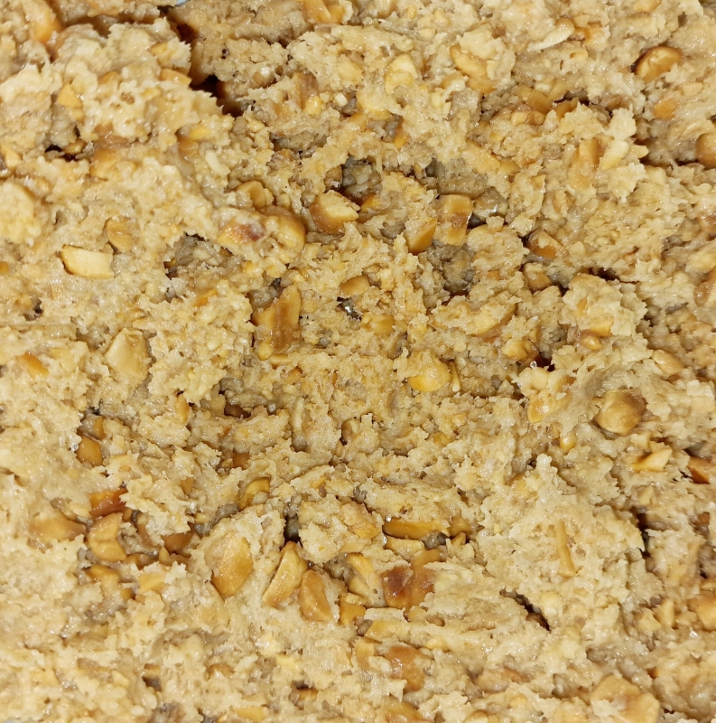 Rest der Erdnüsse mahlen. Müslizauber, gemahlene Erdnüsse, karamellisierte gehackte Erdnüsse, restlichen Karamelltraum, Süße, Pure Flavour Tropfen und das Wasser gut miteinander vermischen.