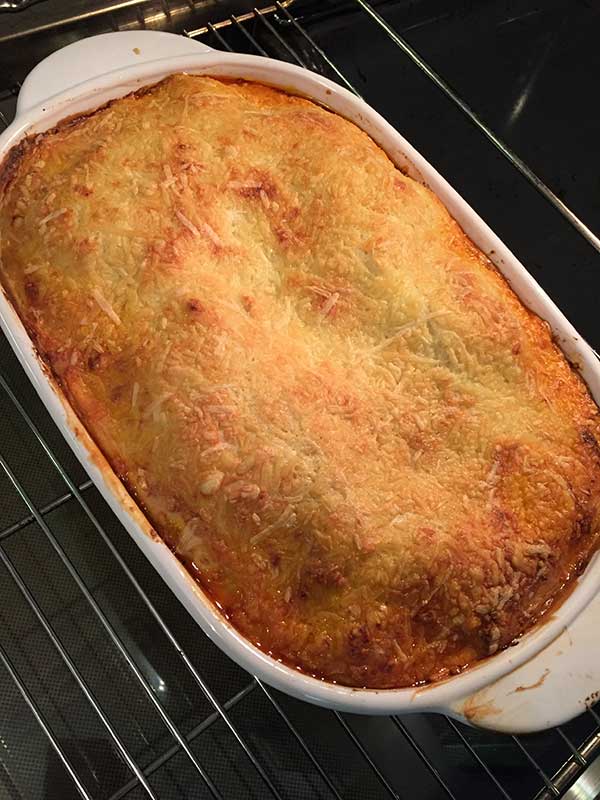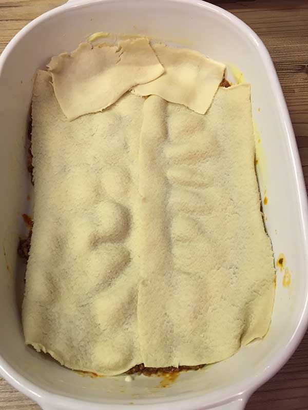 Bolognese, Bechamel und Nudelplatten immer abwechselnd schichten! Immer mit Bolognese und Bechamel beginnen, dann pappen die Nudeln nicht am Boden fest.