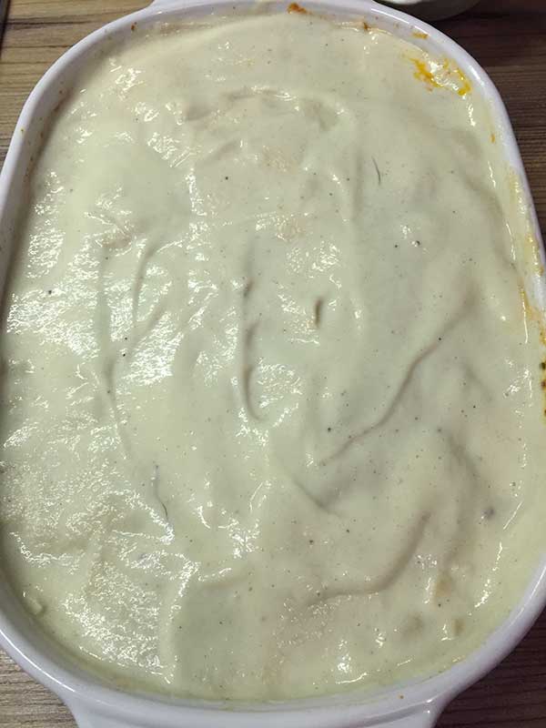 Nach der letzten Schicht Nudeln, oben nur noch Bechamel darauf geben und dann den Mozarella (oder anderen Käse Deiner Wahl)