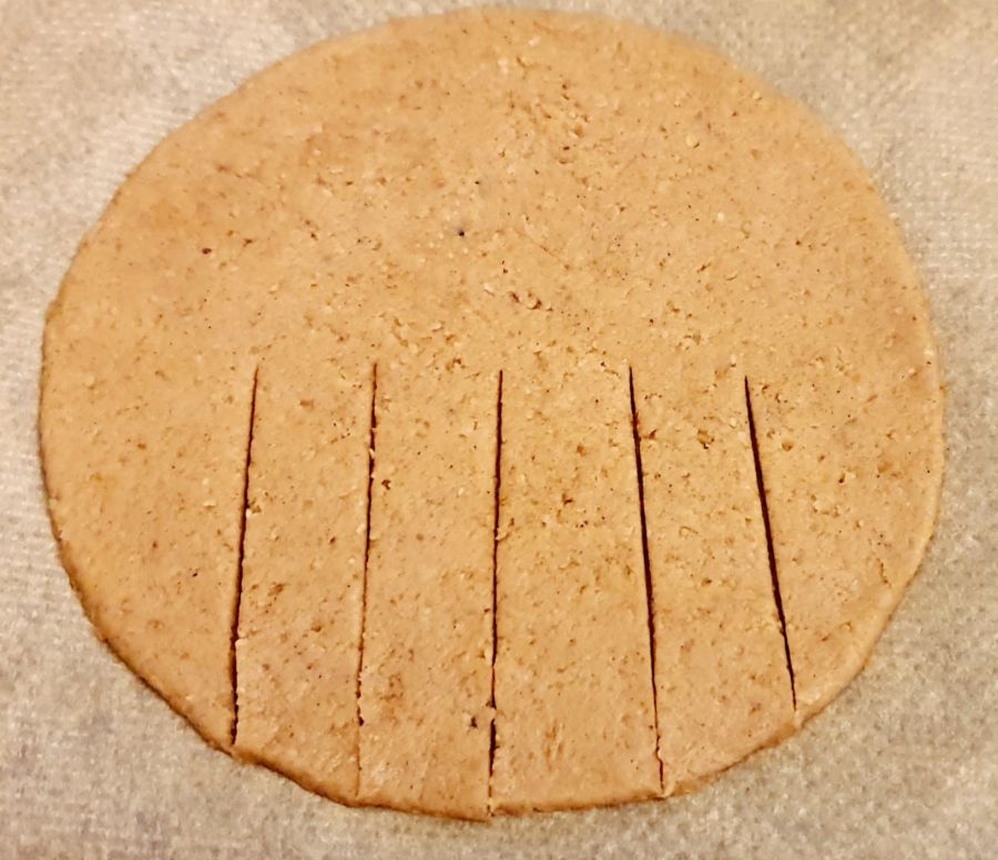 Teig aus dem Kühlschrank holen und gut 15 Minuten bei Zimmertemperatur entspannen lassen. Einmal durchkneten. Dann zwischen zwei Blatt Backpapier ca. halben Zentimeter dick ausrollen. Mit einer Schüssel 12 cm Kreise ausstechen.