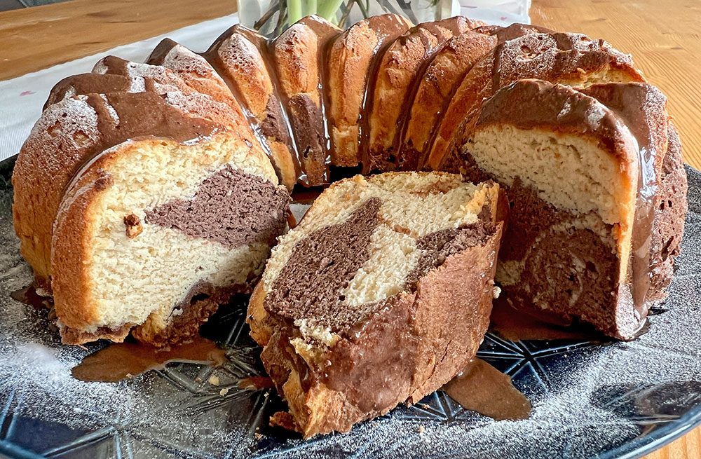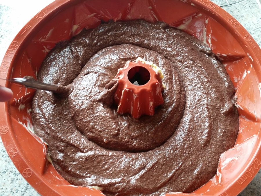 Marmormuster: Variante 1: Die Hälfte des Teiges entnehmen und die andere Hälfte mit dem Backkakao verrühren. Anschließend abwechselnd in mehreren Portionen in die Form schichte. Variante 2 (Mokkavariante): Ein Drittel des Teiges in die Form füllen. Den restlichen Teig mit dem Espresso verrühren und die Hälfte davon über den hellen Teig schichten. Das letzte Drittel Teig mit Backkakao verrühren und darüber schichten.Bei beiden Varianten: Zum Schluss mit dem Stiel eines Buttermessers durch den Teig fahren (bis ganz nach unten) für das typische Marmorkuchenmuster.