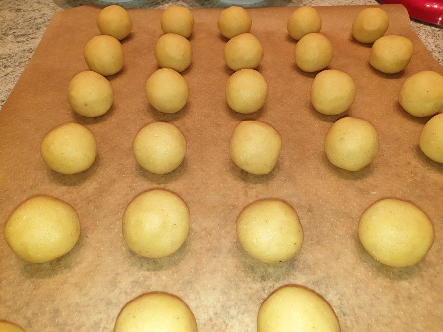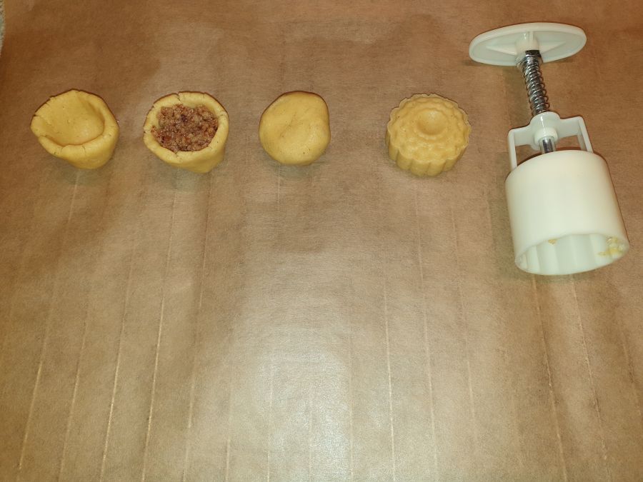 Das Gewichtsverhältnis Teig zu Füllung sollte bei ca. 2:1 liegen. Der kalte Teig wird bei Zimmertemperatur portionsweise verarbeitet, d.h. nur soviel Teig verarbeiten wie gerade verwendet wird. Man formt mehrere Portionen gleich großer Teigkugeln, ca. 38 Kugeln. Mit den Händen eine Mulde hineindrücken, die Füllung hineingeben und mit dem Überstand verschließen.