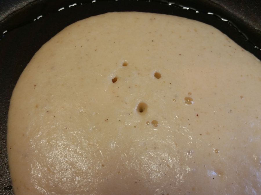Jetzt heisst es, den richtigen Zeitpunkt zum Wenden abzuwarten. Wenn sich auf der Oberfläche vermehrt Bläschen bilden und die meisten dieser Bläschen geplatzt sind, ist es genau richtig.
