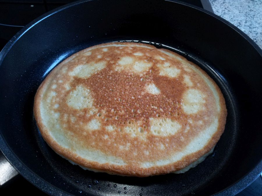Eine Portion in die Mitte der Pfanne geben. Der Pfannkuchen sollte nur so groß sein, dass du am Rand noch genug Platz hast, um den Pfannenwender darunter zu schieben. Bei uns gelingen die Pfannkuchen am besten, wenn sie ca. 15 – 20 cm Durchmesser haben.