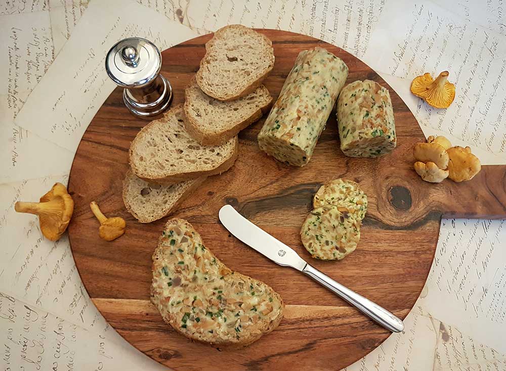 Die zimmerwarme Butter mit der kalten Pfifferlmischung vermengen und zu einer Rolle drehen. Im Kühlschrank fest werden lassen.