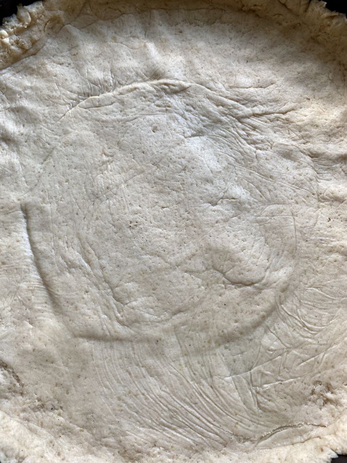 • Den Teig in die Form drücken und Rand etwas hoch ziehen - geht mit feuchten Händen wunderbar.