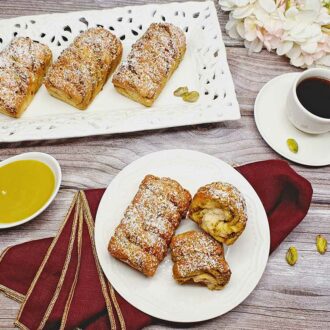 In die Batzenform setzen. Mit Ei bestreichen und mit Pistazien bestreuen.