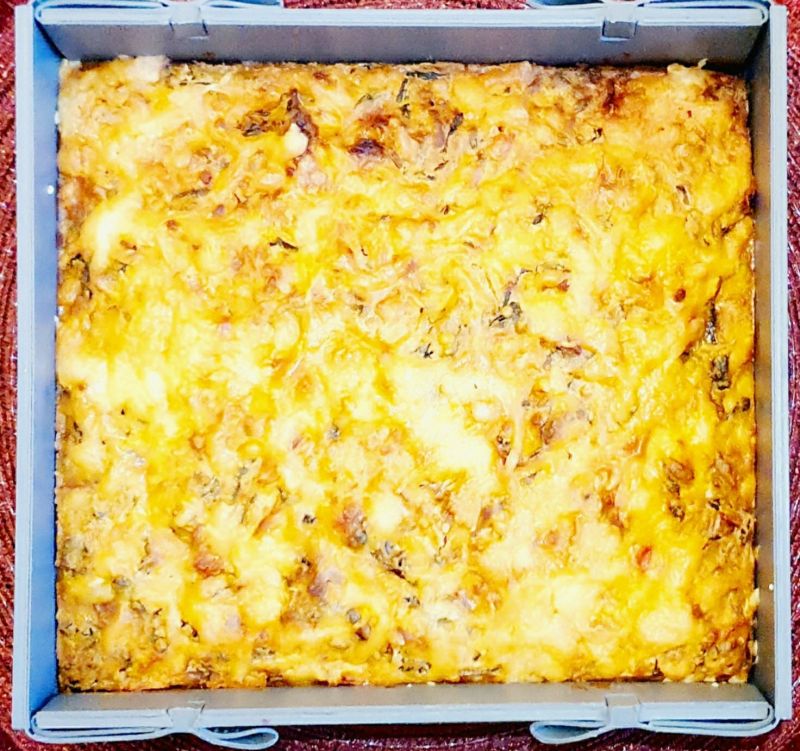Die Masse auf den zweiten Teig gießen und mit dem Käse bestreuen. Die Backform einmal aufklopfen.