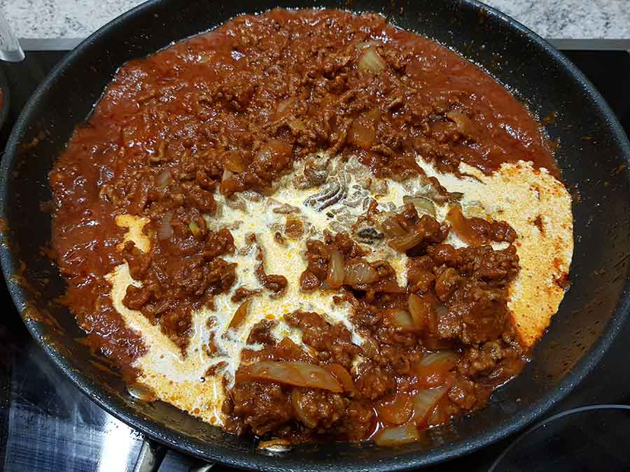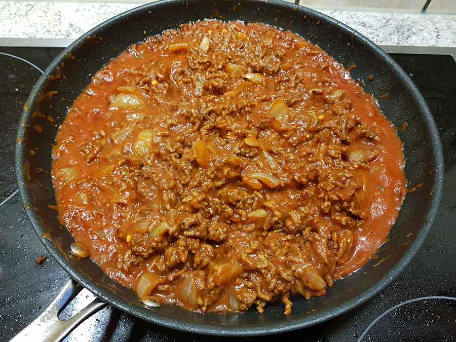 Wenn die Zwiebeln glasig und das Hackfleisch vollständig durchgebraten ist: mit Rotwein ablöschen und den Senf unterrühren. Ein paar Minuten schmoren lassen, das Tomatenmark zugeben und gut unterrühren.