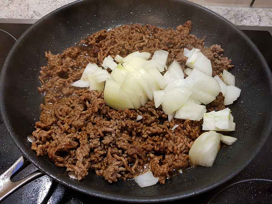 Die Zwiebeln kleinschneiden und zugeben, sobald vom Hackfleisch nur noch wenige rohe Stellen zu sehen sind. Den Knoblauch feinhacken und ebenfalls kurz mitbraten.