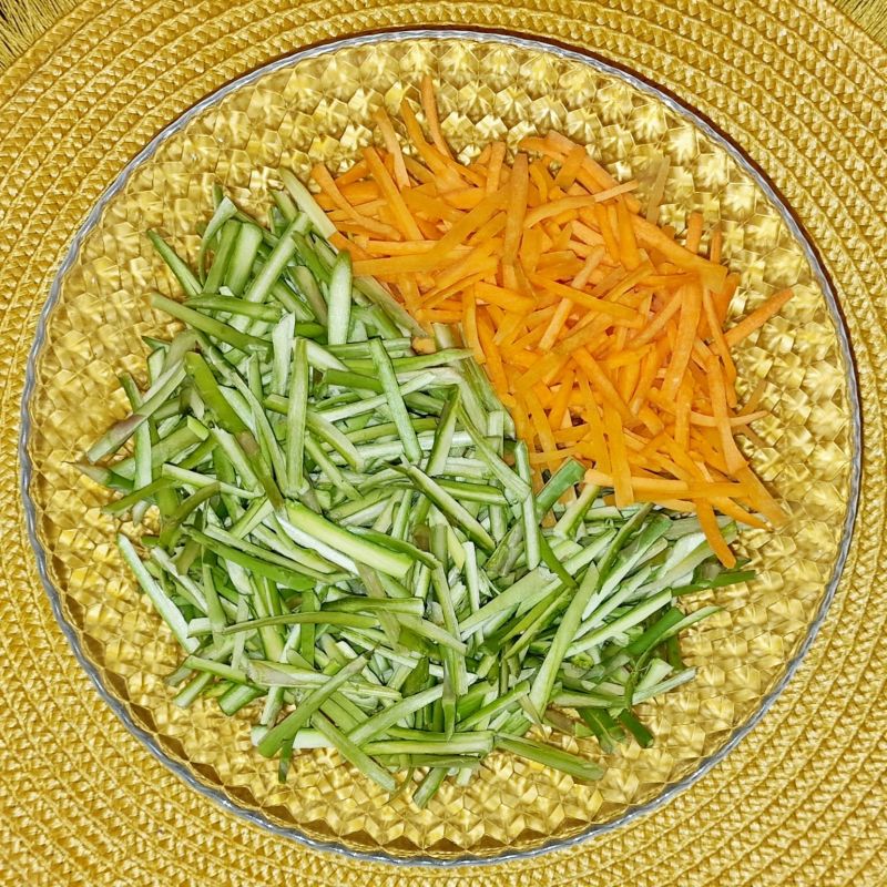 Für die Spargelrolle den Spargel und die Karotte in Stifte schneiden, in einer Pfanne Butterschmalz erhitzen und Spargel und Karottenstifte kurz anbraten. Zum Abkühlen zur Seite stellen.