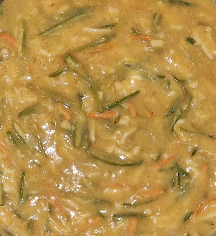 Eier, Milch mit einem Schneebesen verquirlen, Pfannkuchen & Waffel Teig hinzufügen und gut klumpenfrei verrühren. Den Suppentraum unterrühren und zuletzt die Spargel Möhrenmischung. Gut durchgerührt 15 Minuten rasten lassen.