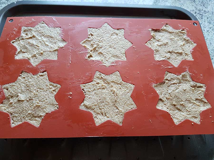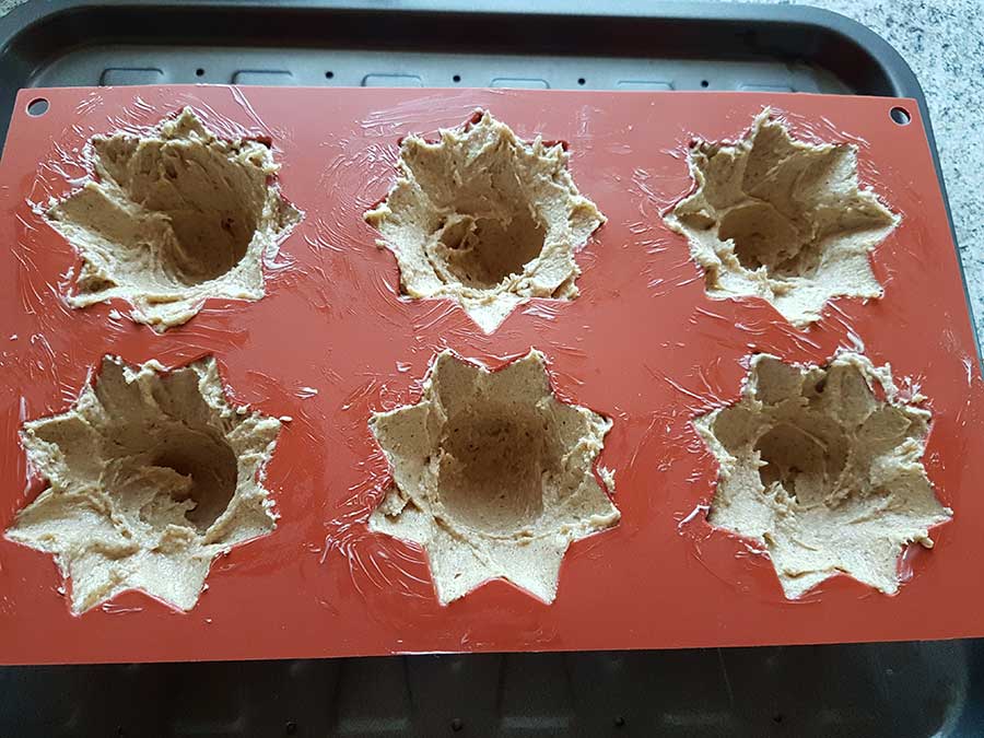 Den Teig in Muffinförmchen füllen – wir hatten wunderhübsche sternförmige XXL-Muffin-Förmchen (Link siehe weiter unten), da passt der Teig exakt hinein, ansonsten geht auch eine normale Muffinform mit 12 Mulden.