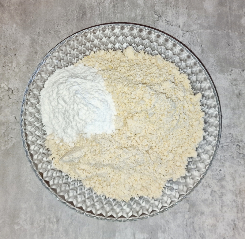 Berlinermischung, Mandelteig und Bambusfaser miteinander vermischen und durch ein feines Sieb sieben.