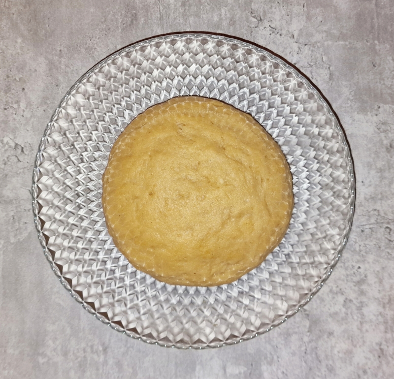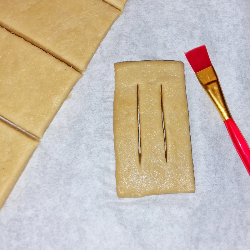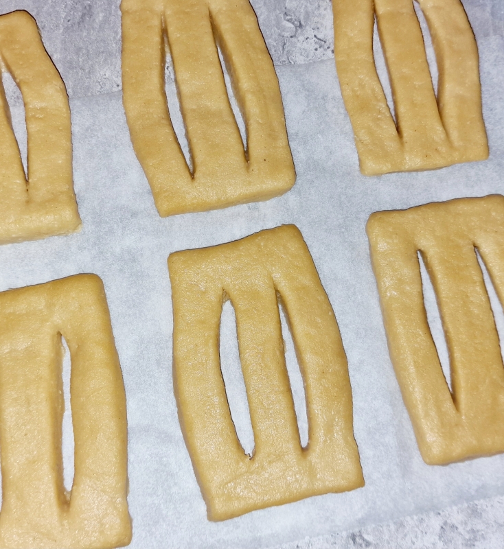 Nach dem Ruhen den Teig zwischen 2 Blatt Backpapier auf 1cm Dicke ausrollen.