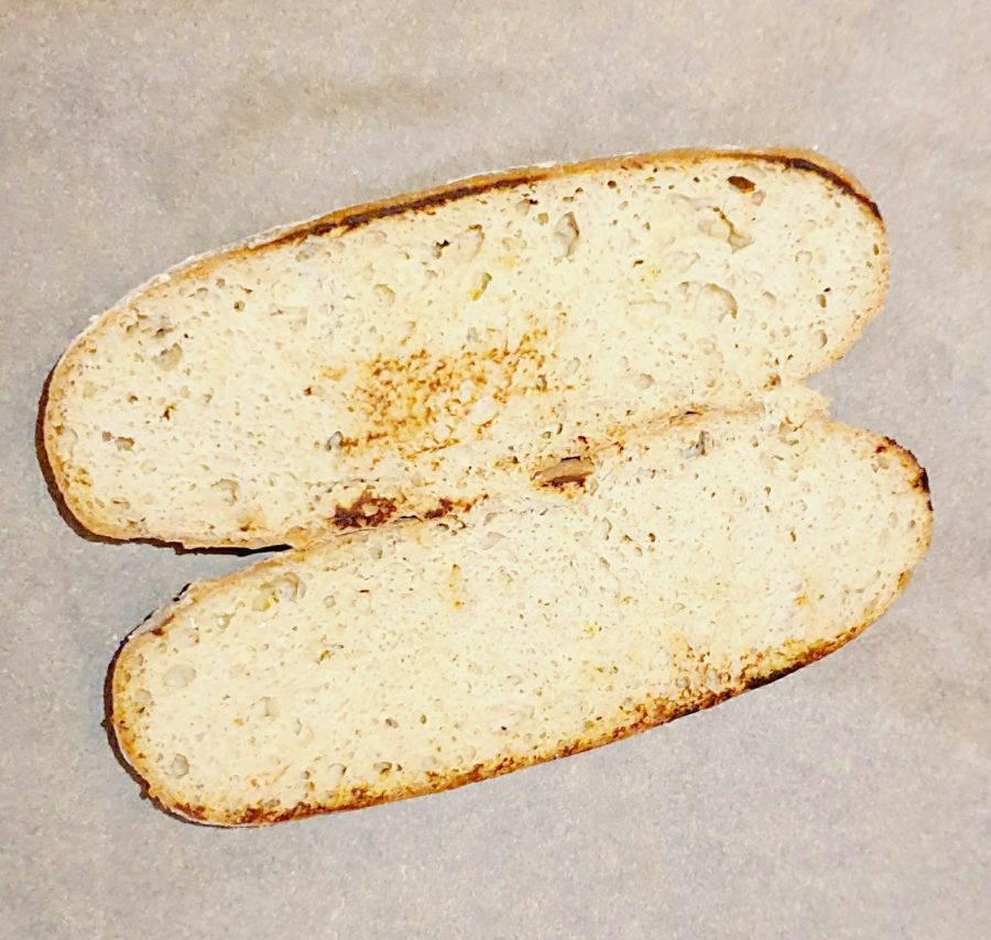 In einer beschichteten Pfanne die Baguettes mit der Innenseite in die Pfanne legen und kurz anrösten. Etwas abkühlen lassen.