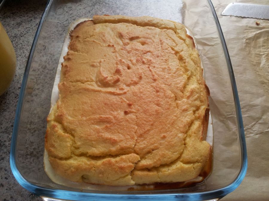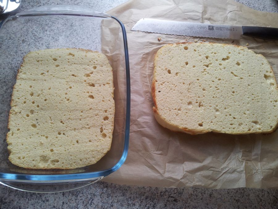 Den Biskuitboden aus der Form stürzen und auskühlen lassen. Mit einem scharfen Messer in 2 Böden schneiden und einen der Böden in die Auflaufform legen.