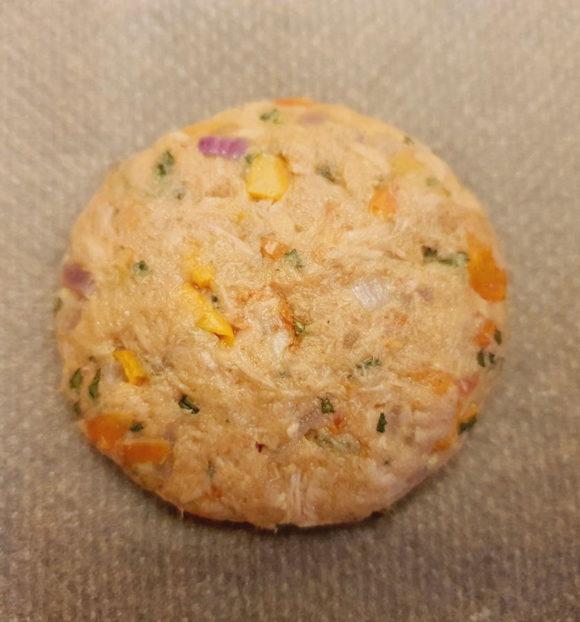 Aus der Masse Laibchen (ca. 70g) formen, ergibt 7 Stück. Die Laibchen auf ein Blech mit Backpapier setzen und bei 170 Grad Umluft für 25 - 27 Minuten backen. (Auf eigenen Backofen achten)