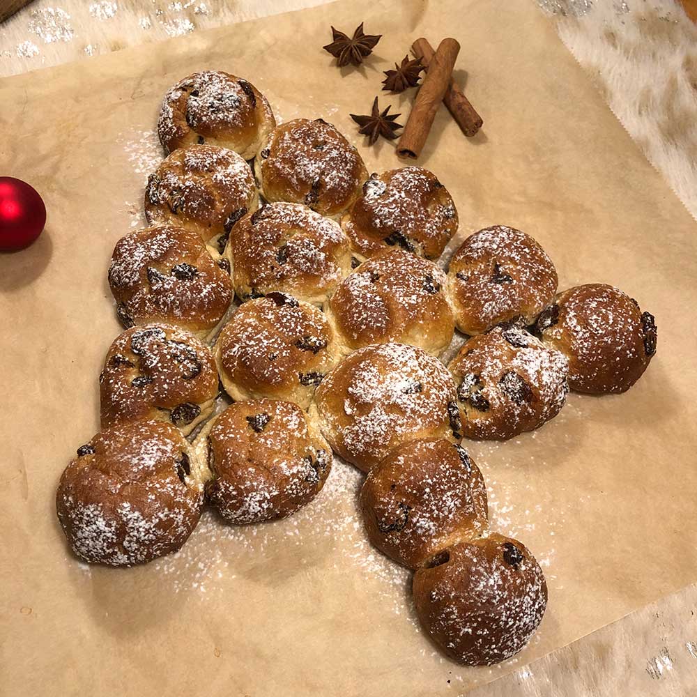 Aus den Teig 17 Stück Bällchen formen. Die Bällchen auf einem mit Backpapier belegten Blech als Baum anordnen. Zwischen den Bällchen unbedingt 1 cm Abstand lassen - wächst beim Backen zusammen. Leicht mit Bambusfaser besieben für die Schneeoptik.