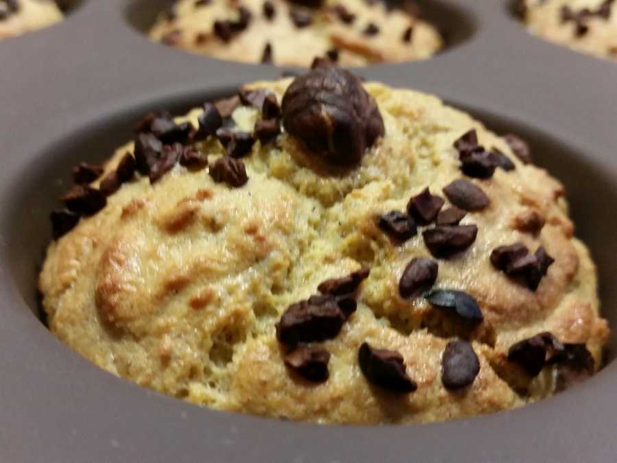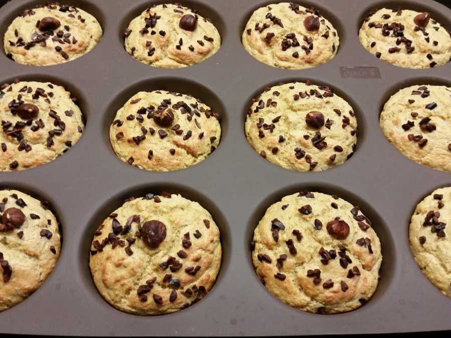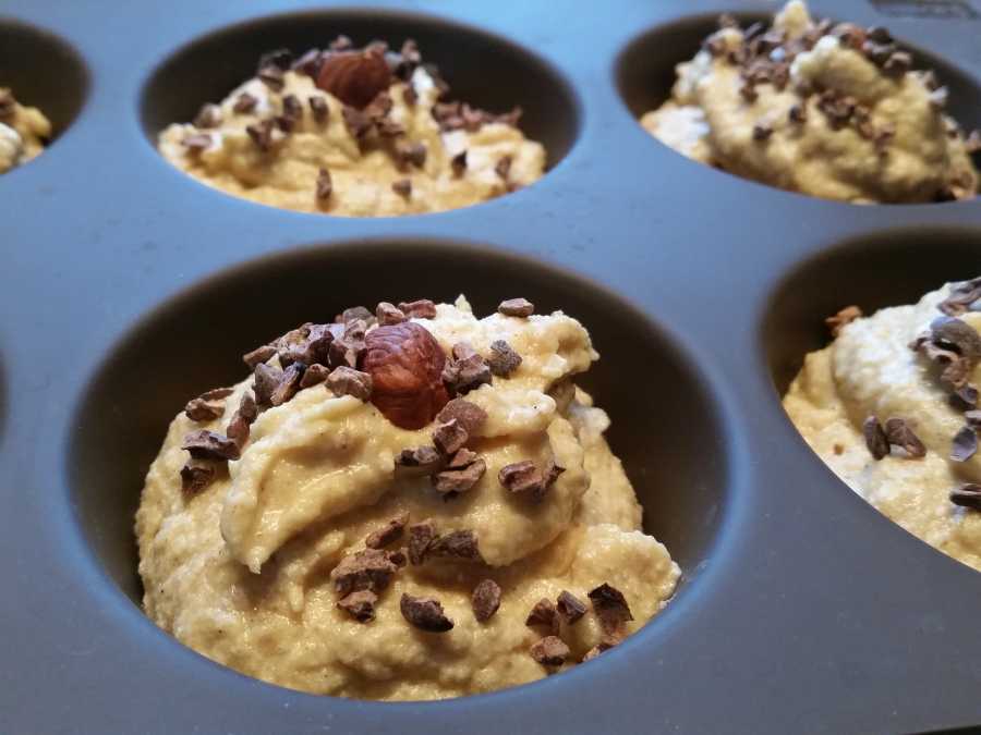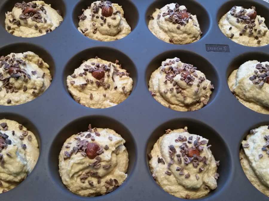Die Kakaobutter mit der Butter zusammen schmelzen und unter Rühren zum Teig geben. In eine Muffinform füllen, mit Haselnüssen und Kakaobohnensplittern dekorieren und bei 175 °C im vorgeheizten Backofen 15 – 20 Minuten bei Umluft oder 20 – 25 Minuten bei Ober- und Unterhitze backen.