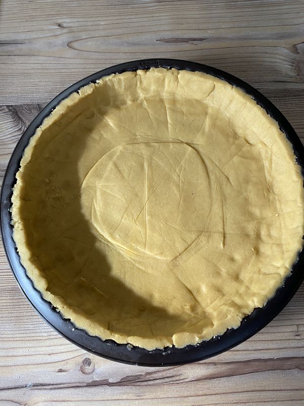In einer antihaftbeschichteten Quicheform den Teig ausrollen und die Ränder hochziehen.