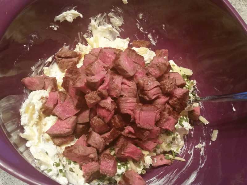 Die beiden Frischkäsesorten mit den beiden geriebenen Käsesorten gut verrühren und mit Schnittlauch, Salz und Pfeffer würzen. Das Rindfleisch in ca. 1 cm dicke Würfel schneiden und zusammen mit dem Gemüse aus der Pfanne unter die Käsemasse rühren. Alles in eine Auflaufform füllen und bei 175 °C für ca. 30 Minuten in den Ofen schieben.
