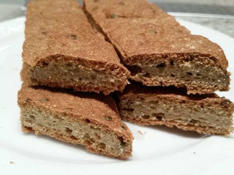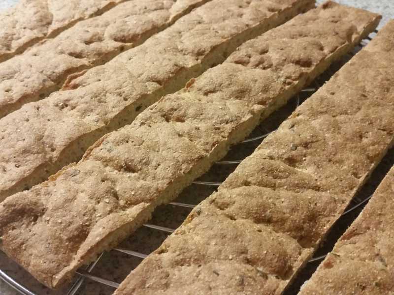 Im vorgeheizten Backofen bei 175 °C Umluft ca. 50 Minunten backen (60 Minuten bei Ober- und Unterhitze). Anschließend sofort vom Backpapier ablösen und auf einem Gitter etwas abkühlen lassen. Die Streifen mit einem Messer voneinander trennen, erneut auf Backpapier legen und weitere 30 – 45 Minuten bei 140 °C trocknen (länger wenn du es besonders knusprig und kross magst).